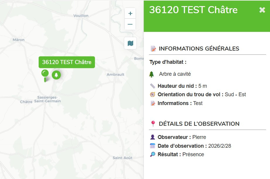 Une carte permet de visualiser la présence de colonies observées par les contributeurs. Une consultation de la carte de votre secteur est vivement conseillée avant de déclarer votre emplacement, elle permet de vérifier si le nid est déjà repertorié ou si le nom est déjà utilisé.